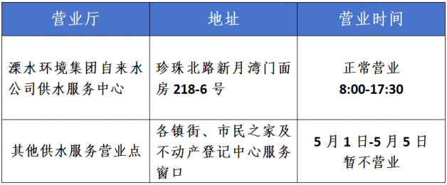 ?依據(jù)國(guó)務(wù)院辦公廳《關(guān)于2025年部分節(jié)假日安排的通知》,結(jié)合供水服務(wù)工作的實(shí)際情況,勞動(dòng)節(jié)期間溧水環(huán)境集團(tuán)自來(lái)水公司各供水服務(wù)營(yíng)業(yè)點(diǎn)放假安排如下: